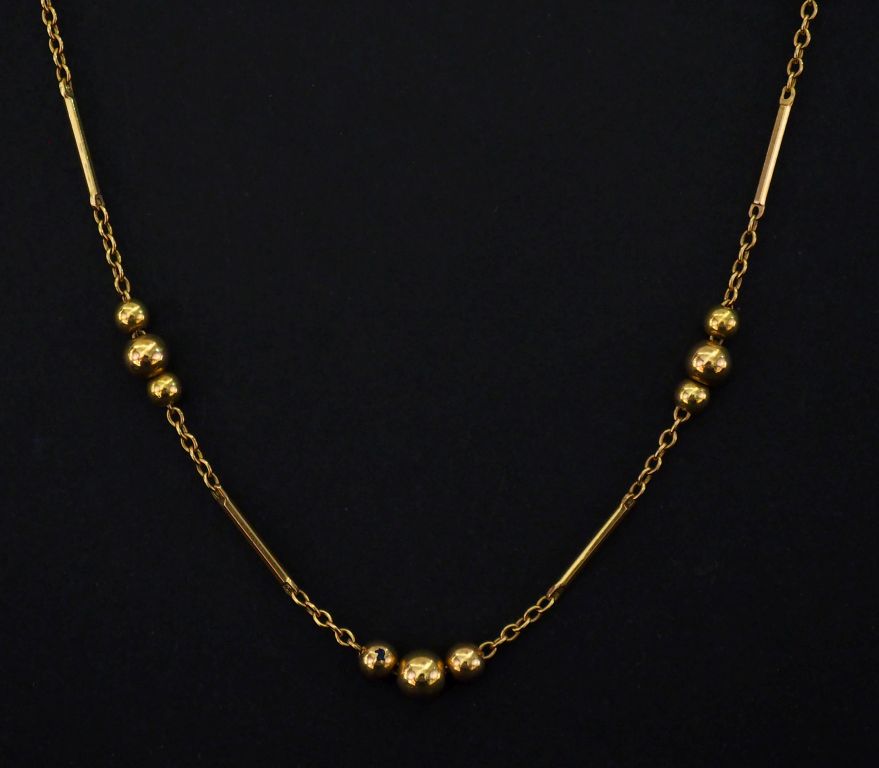 Collier souple en or jaune 750, composé de maillons rectangulaires et de perles en or 750 alternés. Long. 53 cm Poids. 9,89 g
