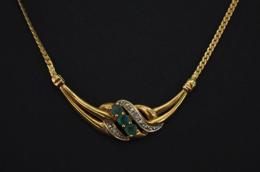 Collier souple en or jaune 750, maille plate gourmette, orné en son centre d'un motif ajouré serti d'une émeraude et agrémenté de deux petits diamants. Long. du motif central : 2,8 cm Long. totale : 42,8 cm Poids tel. 7,41 g