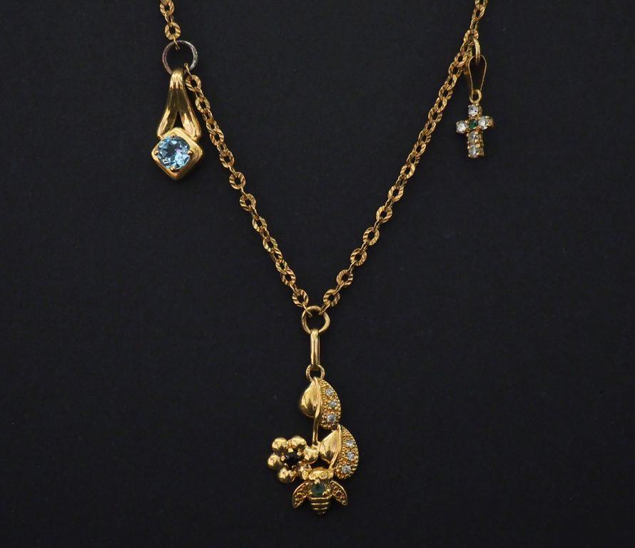 Collier souple en or jaune, maille forçat, agrémenté de quatre pendeloques : trois en or (l'une en forme de cœur, l'autre sertie d'une pierre bleu ciel et la dernière en forme de croix sertie de pierres fantaisie) et une en métal doré. Long. 46 cm Poids tel. 11,62 g (accident)