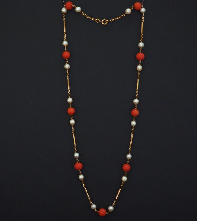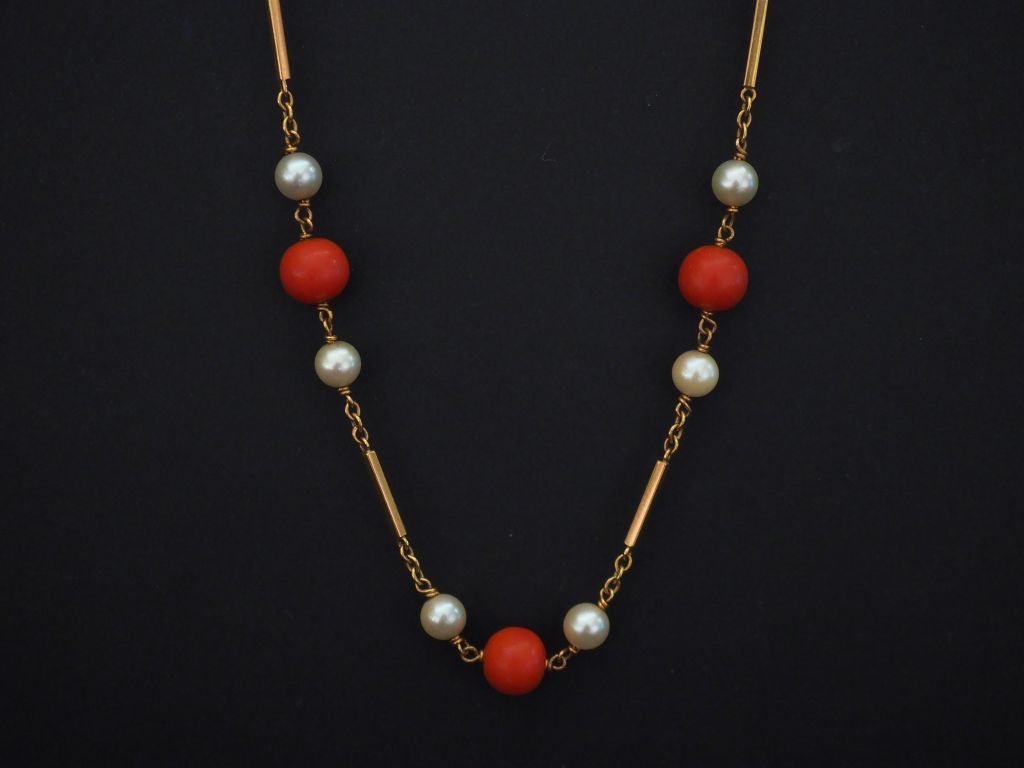 Collier souple en or jaune, perles de corail et perles blanches. Long. 52 cm Poids tel. 17,52 g