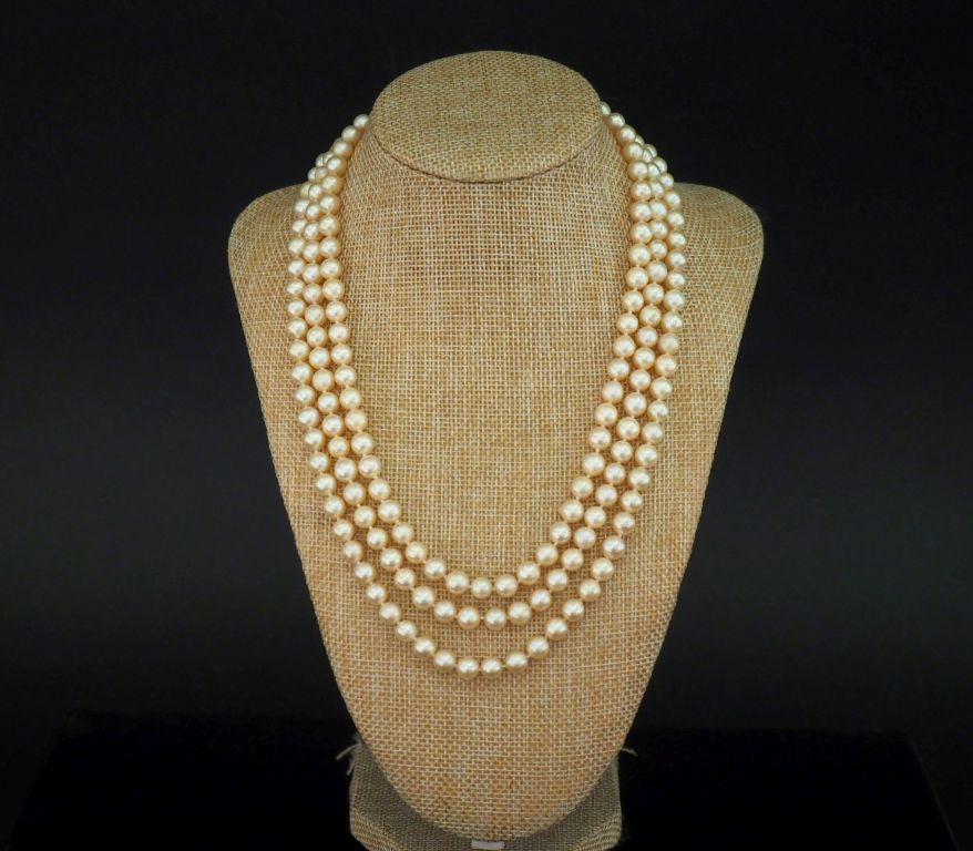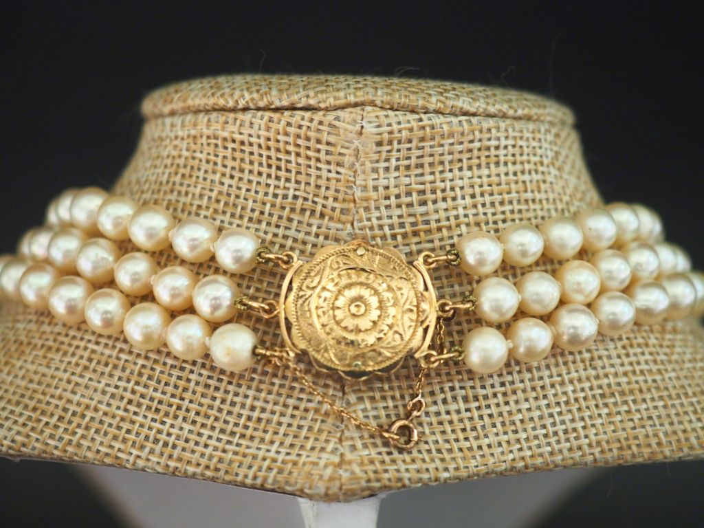 Collier triple rangs de perles de culture blanches, agrémenté d'un joli fermoir en or jaune 750 et argent, serti en son centre d'une améthyste entourée d'une couronne de petits diamants taillés en rose. Long. 45 cm Diam. du fermoir : 2 cm Poids tel. 90 g