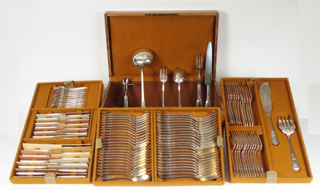 Dans un coffret en chêne. Ménagère de style Louis XVI en argent, poinç...