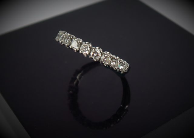 Demi-alliance américaine en or gris, en partie sertie de brillants. Poids : 3,9 g