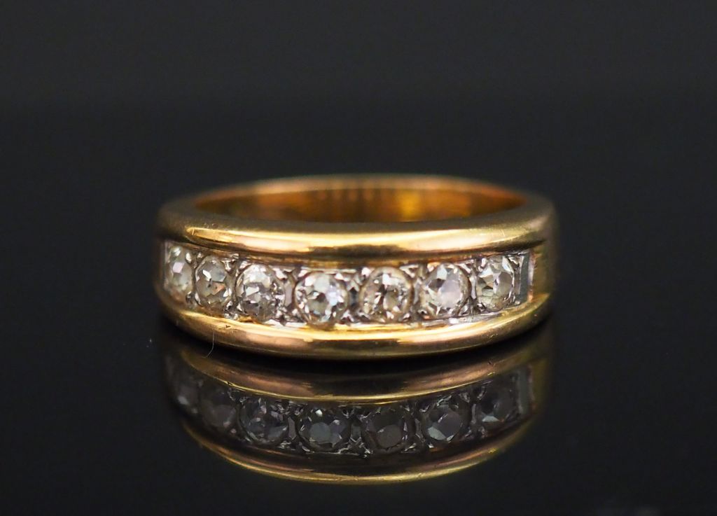Demi alliance américaine en or jaune, sertie d’une ligne de sept diamants. TDD. 55 Poids tel. 6,15 g