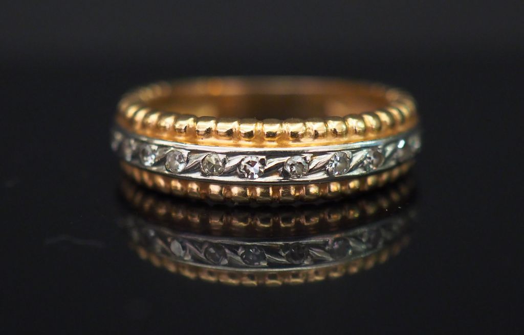 Demi-alliance deux tons d’or, sertie d’une ligne de onze petits diamants. TDD. 52 Poids tel. 3,40 g