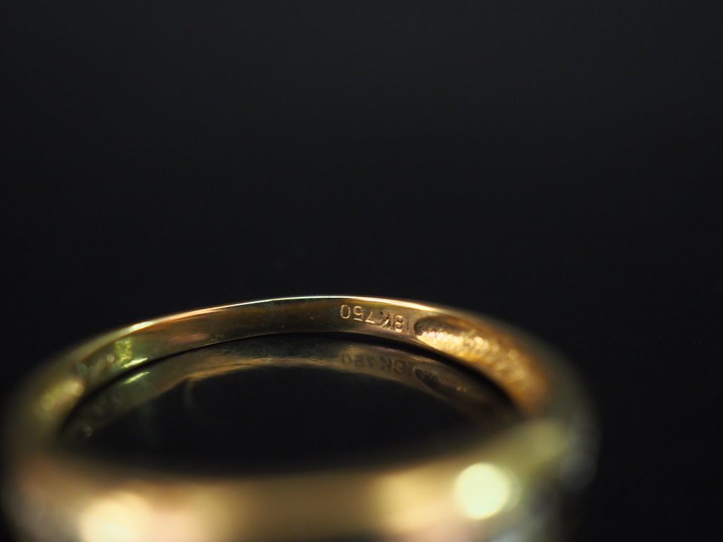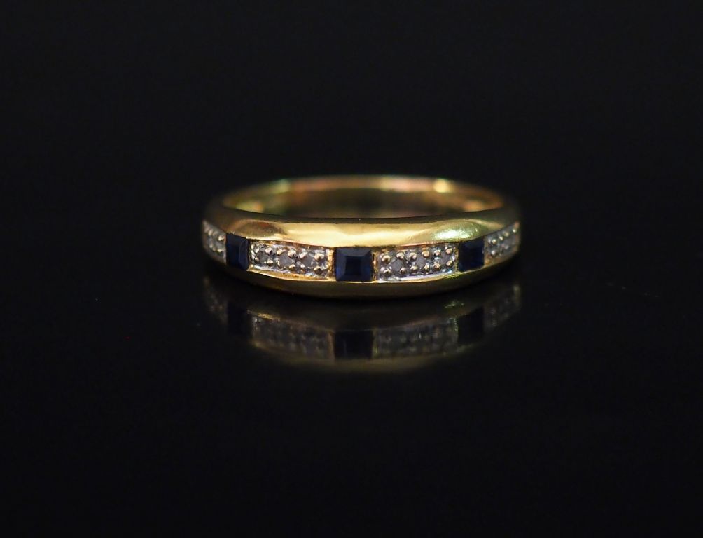 Demi-alliance en or jaune, sertie de pierres bleues calibrées et petits diamants. TDD. 59 1/2 Poids tel. 2,40 g
