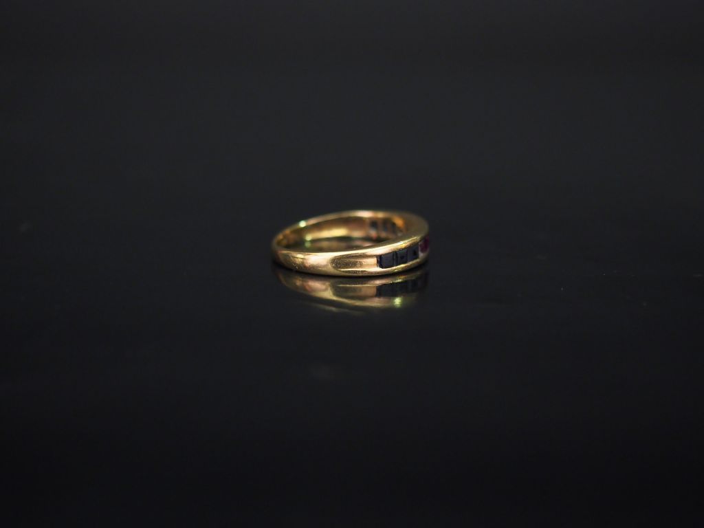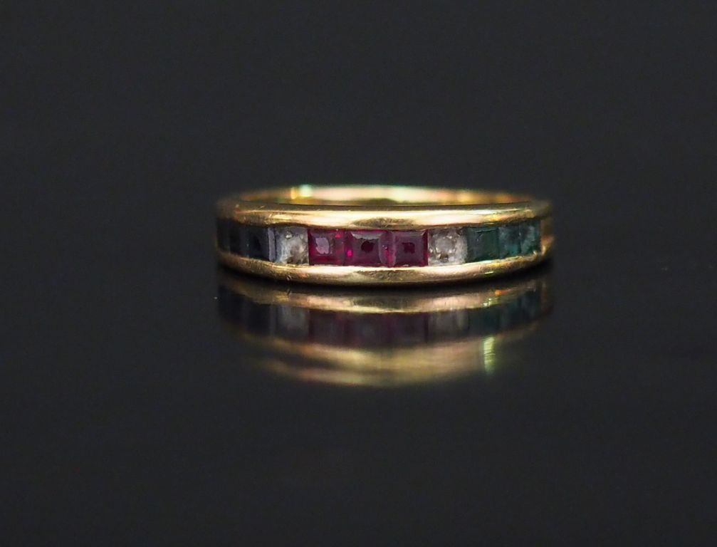 Demi-alliance en or jaune, sertie de pierres de couleur calibrées. TDD. 51 Poids tel. 2,79 g (manque deux pierres)