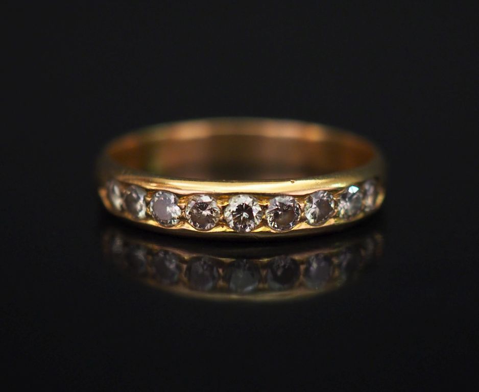 Demi-alliance en or jaune, sertie d’une ligne de neuf petits diamants. TDD. 58 Poids tel. 2,95 g
