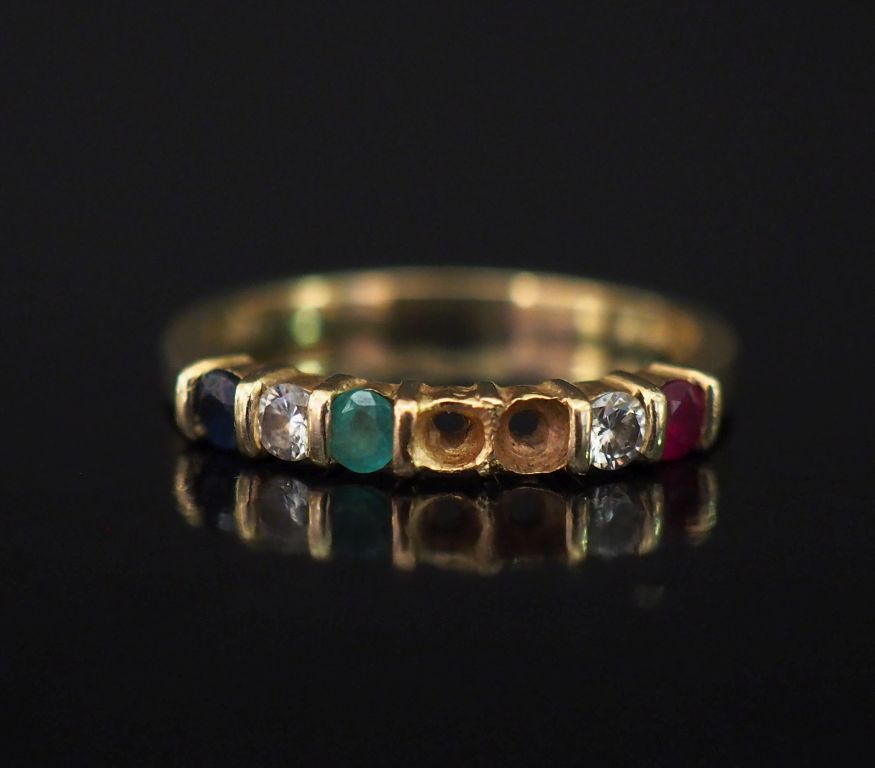 Demi alliance or jaune 9k, sertie de deux diamants et pierres de couleur. TDD. 52 Poids tel. 2,05 g (manque deux pierres)
