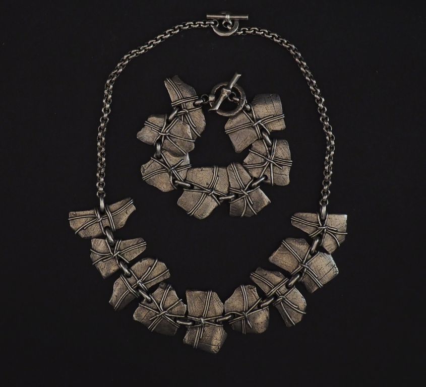 Demi parure en métal argenté ou argent bas-titre, à décor de motifs abstraits. Comprenant : un collier et un bracelet.