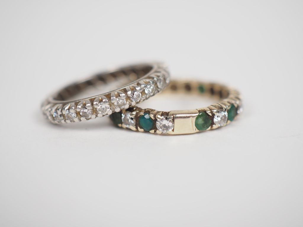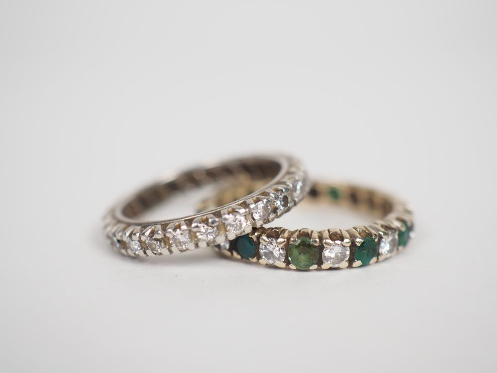 Deux différentes alliances américaines : l'une en or blanc et diamants et l'autre en or blanc, diamants et émeraudes. TDD. 49 et 53 Poids tel. 6,47 g