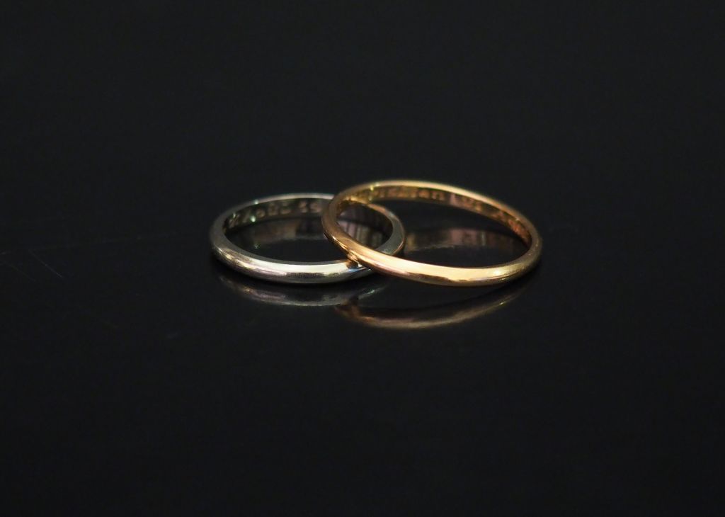 Deux différentes alliances. L'une en or jaune, l'autre en or blanc. TD...