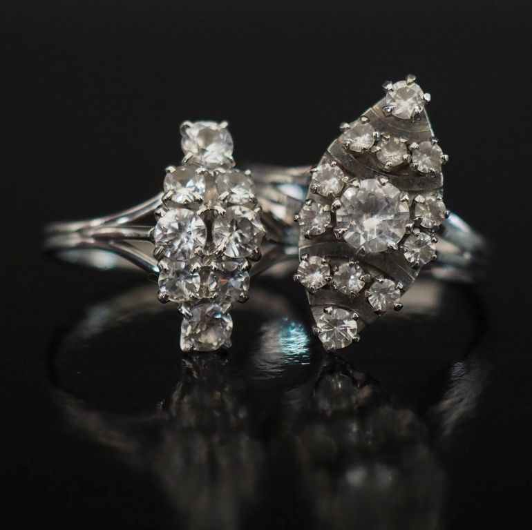 Deux différentes bague de forme marquise en or blanc 750, serties de pierres à l'imitation du diamant. TDD. 52 Poids tel. 6,78 g
