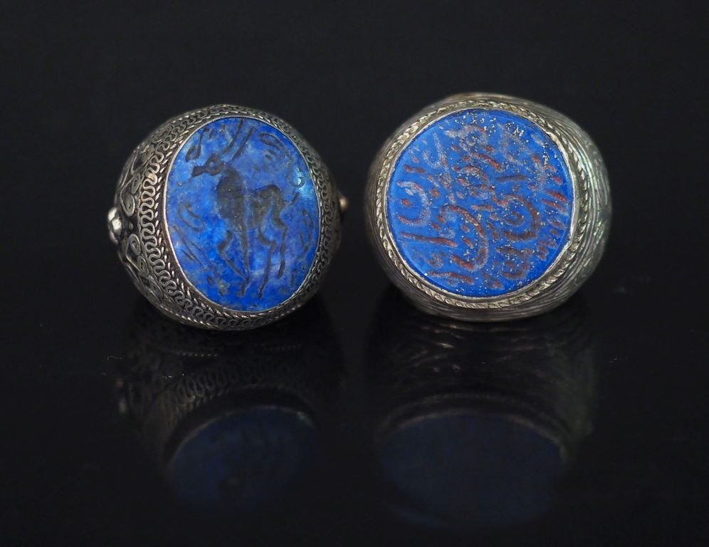 Deux différentes bagues Afrique du Nord en argent et lapis-lazuli (?), serties d'une intaille figurant un cervidé pour l'une et des caractères pour l'autre. Les montures, à décor de rinceaux et de motifs géométriques. TDD. 56 et 57 Poids tel. 52 g