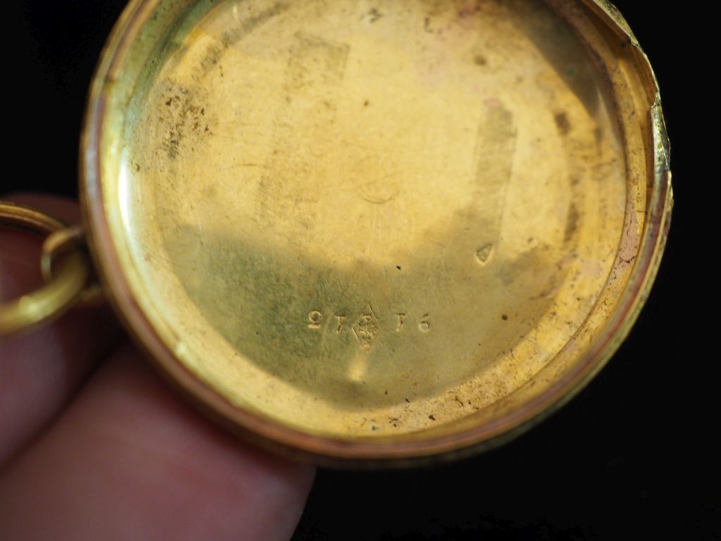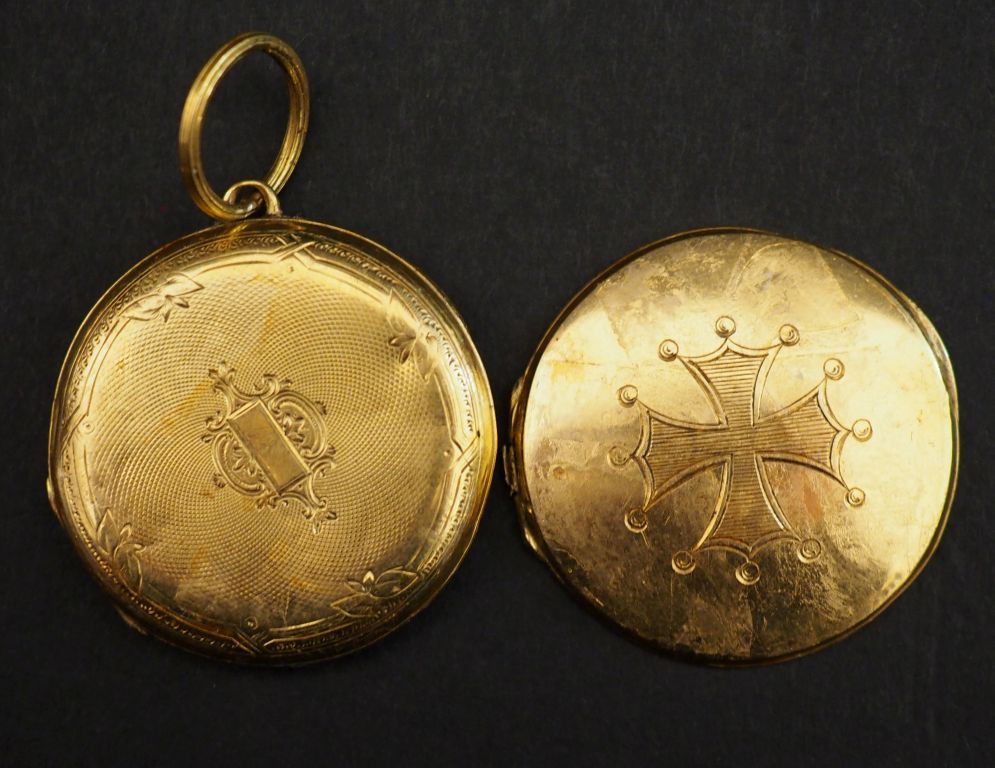 Deux éléments de boitier de montre de col en or jaune 750. L'un, à décor de croix du Languedoc et l'autre, à décor de cartouche et feuillage. Poids. 8,90 g