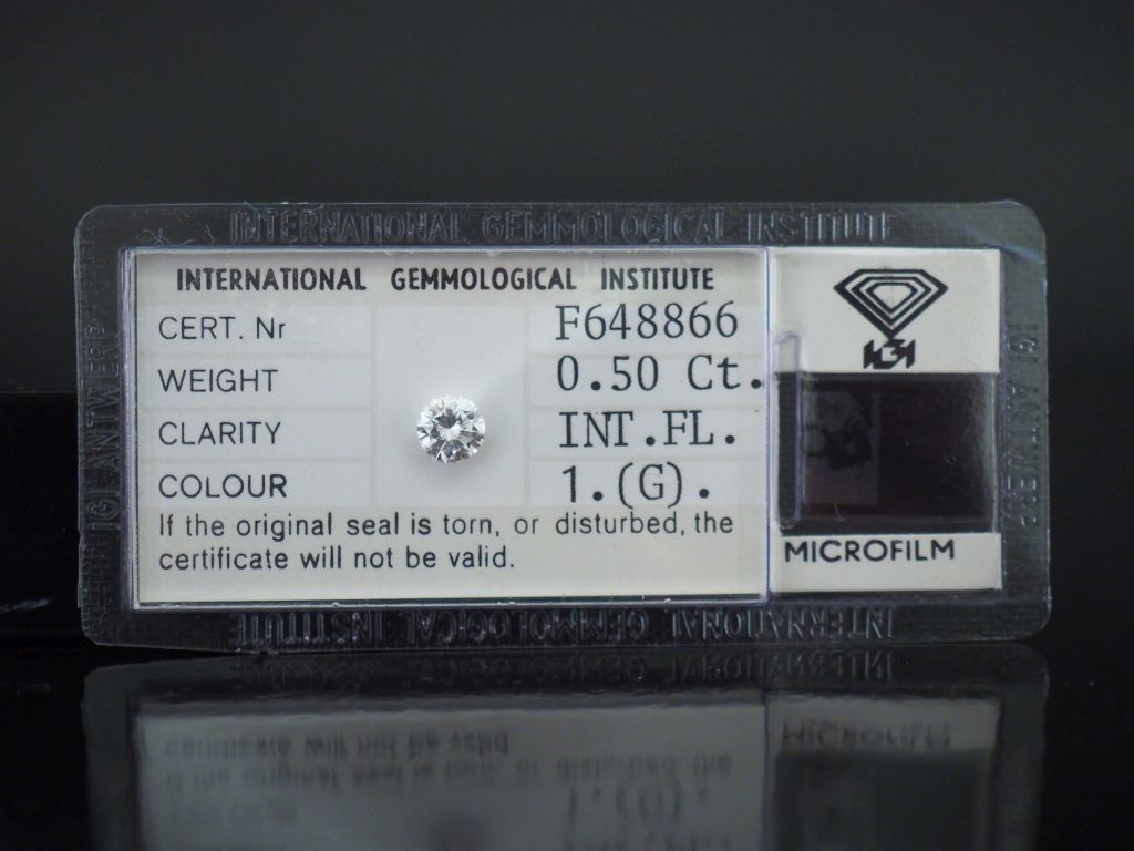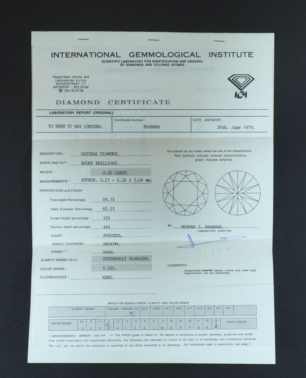 Diamant de 0,5 ct sur papier, taille ronde brillant, G-IF. Avec son certificat de l’International Gemmological Institute en date du 26/06/1979.