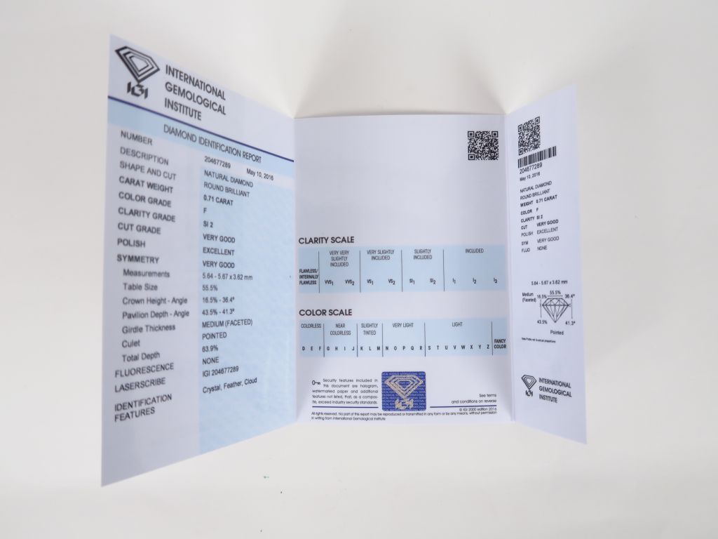 Diamant sur papier de 0,71 cts env. F. SI 2 avec certificat International Gemological Institute number 204677289