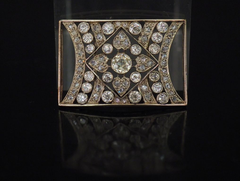 Elément de bracelet en or blanc, à décor ajouré et serti de diamants taillés en rose. Le diamant central pesant environ 0,4 ct. 2,5 x 3,8 cm Poids tel. 8 g