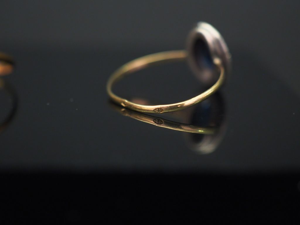 Ensemble comprenant : - deux bagues ovales en or jaune et argent, serties en leur centre d'une pierre noire facettée. Elles sont agrémentées de petites pierres fantaisies. TDD. 52 - une bague marguerite en or jaune et argent, sertie d'une pierre bleue entourée de pierre fantaisie. TDD. 55 Poids tel. 7,09 g (anneau légèrement tordu)