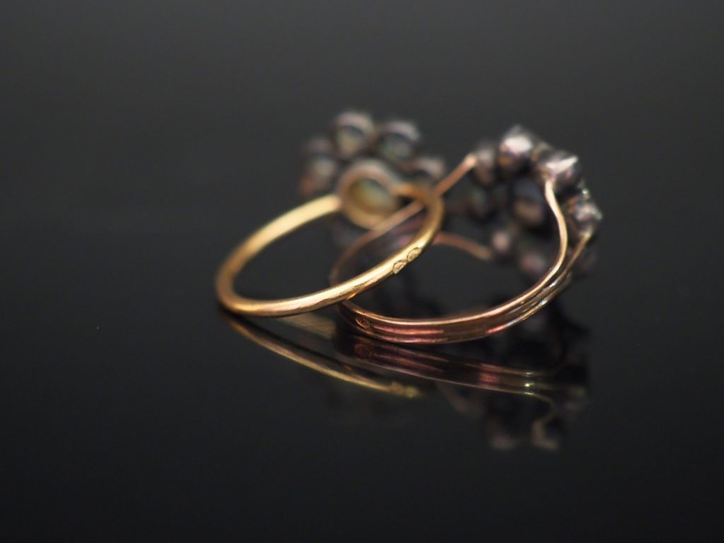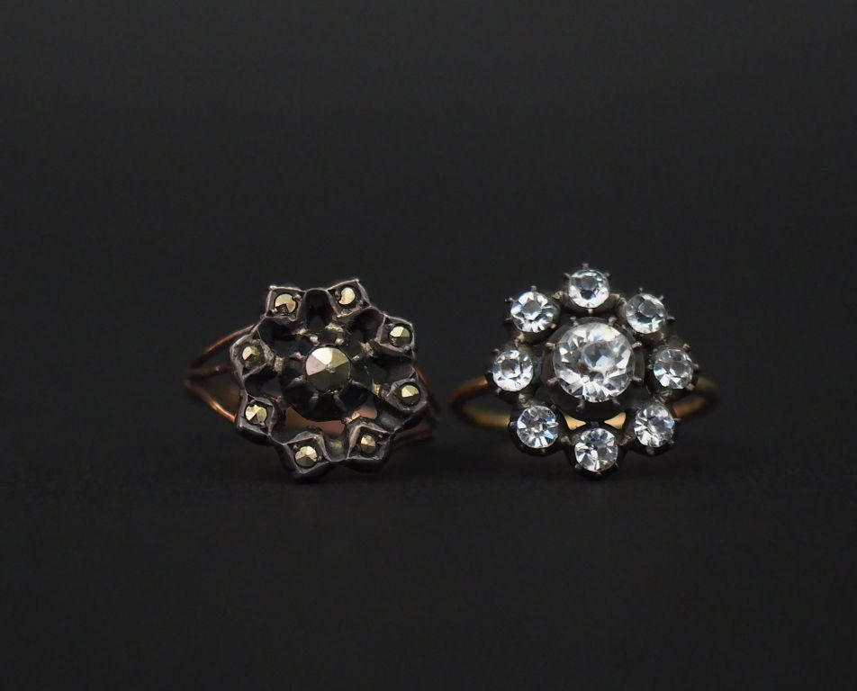 Ensemble comprenant deux différentes bagues de forme marguerite en or jaune et argent, serties de pierres à l'imitation du diamant. TDD. 49 Poids tel. 5,44 g