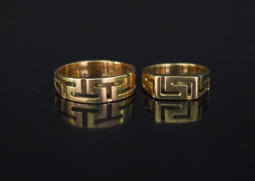 Ensemble comprenant deux différentes bagues en or jaune, à décor ajouré de grecques. TDD. 50 et 59 Poids. 7,62 g