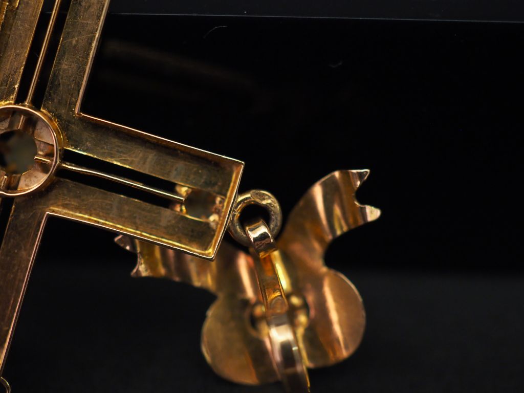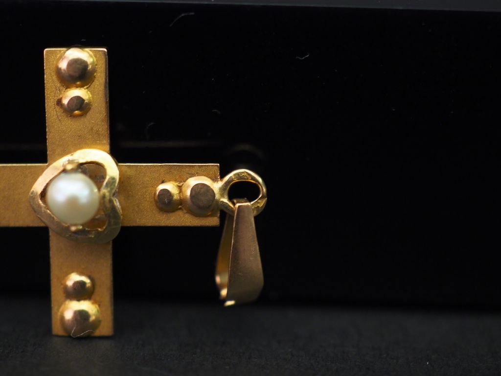 Ensemble comprenant deux différents pendentifs Napoléon III en forme de croix en or jaune et perles. 3 x 1,9 cm et 5 x 3,6 cm Poids tel. 4,70 g