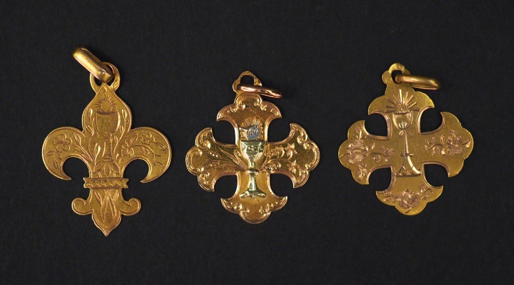 Ensemble comprenant : - deux pendentifs en forme de croix en or jaune, à décor de calice et de fleurs. 2 x 2 cm - un pendentif en or jaune, en forme de fleur de lys, à décor de calice et de branchages fleuris. 2,4 x 2 cm Poids. 2,86 g