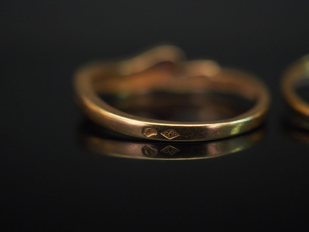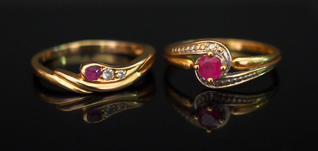 Ensemble comprenant : - Petite bague tourbillon en or jaune, sertie en son centre d’une pierre rose. Monture mouvementée sertie de deux éclats de diamants. TDD. 53 Poids tel. 1,54 g - petite bague de forme stylisée en or jaune, sertie d’une pierre rose et de deux petits diamants. TDD. 52 Poids tel. 2,06 g