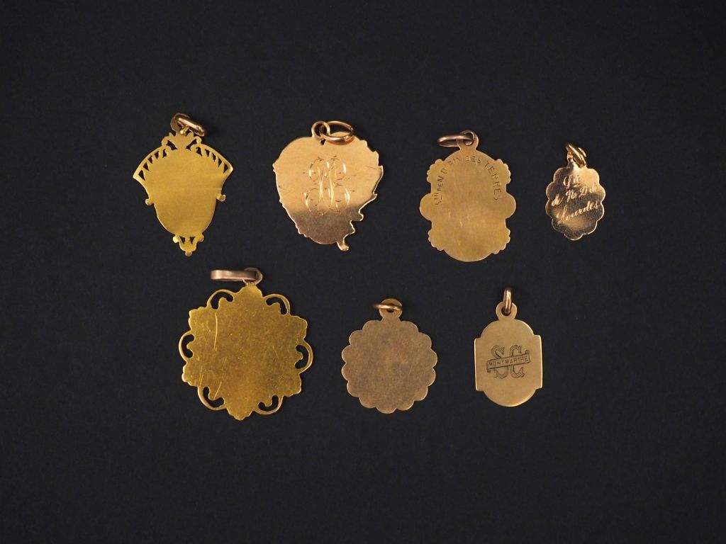 Ensemble comprenant sept différentes médailles religieuses en or jaune, figurant la Sainte Vierge. Poids. 8,86 g (trois d'entre elles gravées au dos)