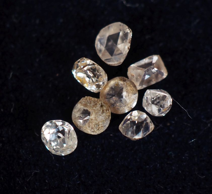 Ensemble comprenant six diamants sur papier pesant environ 0,09 ct (x2), 0,06 ct (x2), 0,03 ct (x2). On y joint deux petits diamants sur papier, l'un de forme rectangulaire, l'autre taillé en rose.