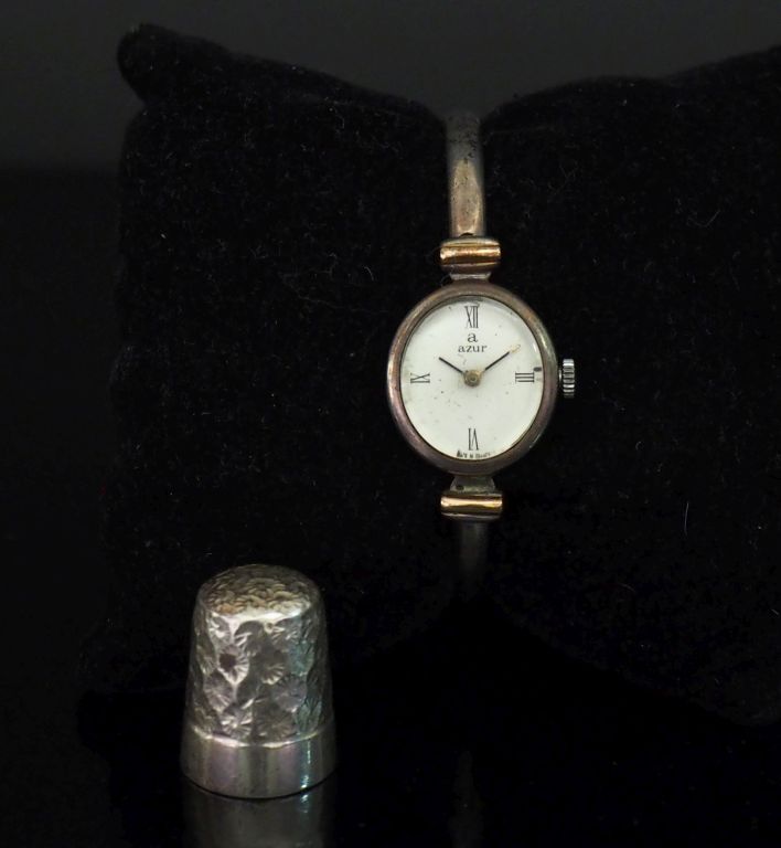 Ensemble comprenant : - un dé à coudre en argent anglais, à décor de fleurettes. - montre montre bracelet en argent de marque AZUR. Cadran ovale à chiffres romains pour les heures. Bracelet jonc. Poids tel. 25,75 g