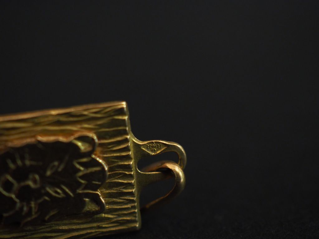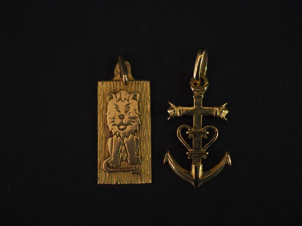 Ensemble comprenant : - un pendentif de forme rectangulaire en or jaune, à décor de lion. 2 x 1 cm - un pendentif en or jaune en forme de croix de Camargue. 2 x 1,2 cm Poids. 3,21 g