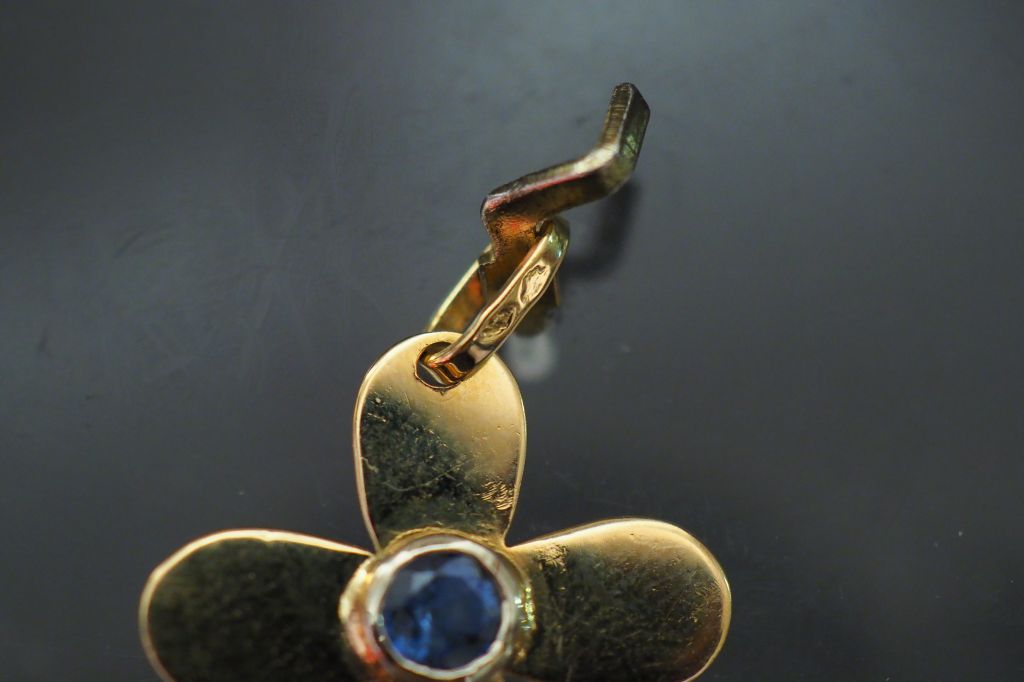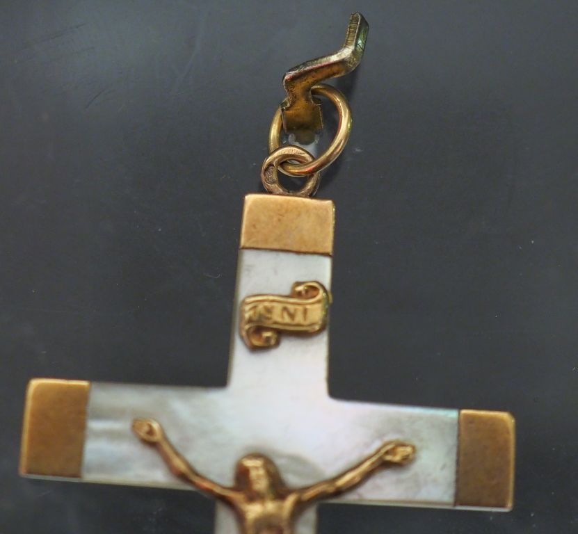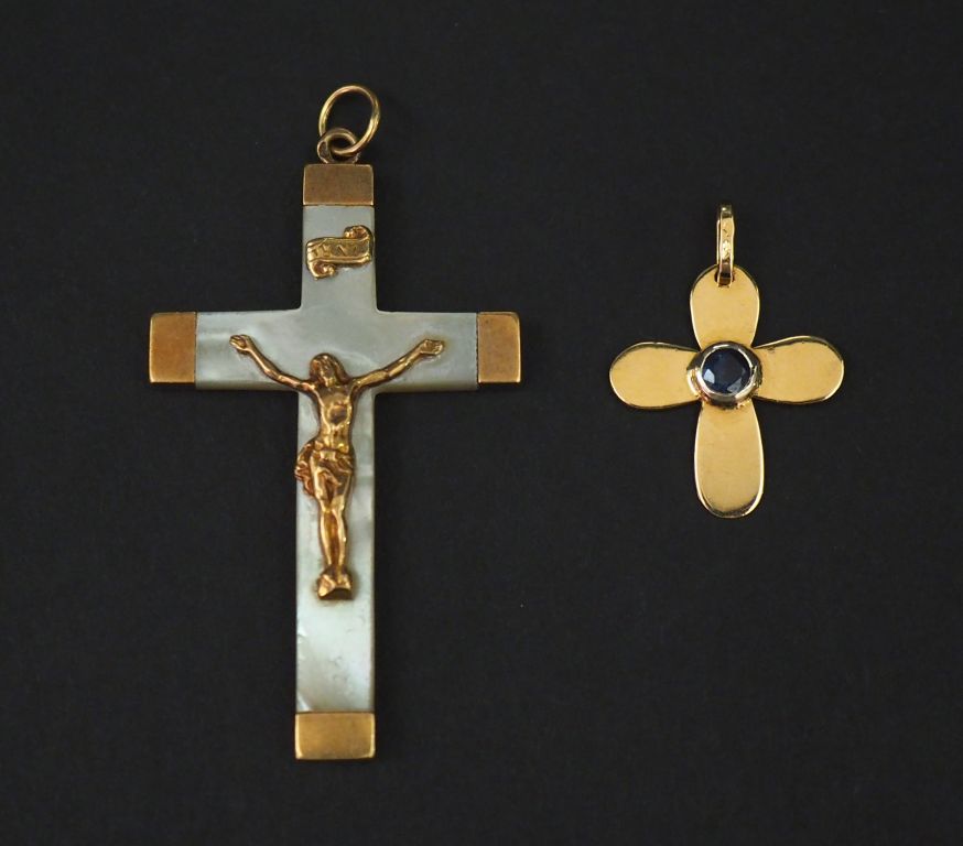 Ensemble comprenant : - un pendentif en forme de croix en or jaune, serti en son centre d’une pierre bleue. Les extrémités arrondis. 2,2 x 1,9 cm - un pendentif en forme de croix en or jaune et nacre. 5 x 3 cm Poids tel. 6,89 g