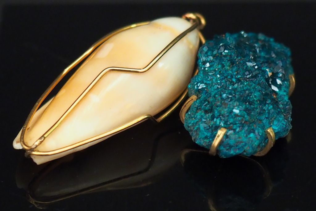 Ensemble comprenant : - un pendentif en or jaune 14k, serti d’un coquillage. Long. 4,5 cm Poids tel. 6,42 g - un pendentif en or jaune, serti d’une pierre de couleur verte. Long. 3,5 cm Poids tel. 13,42 g