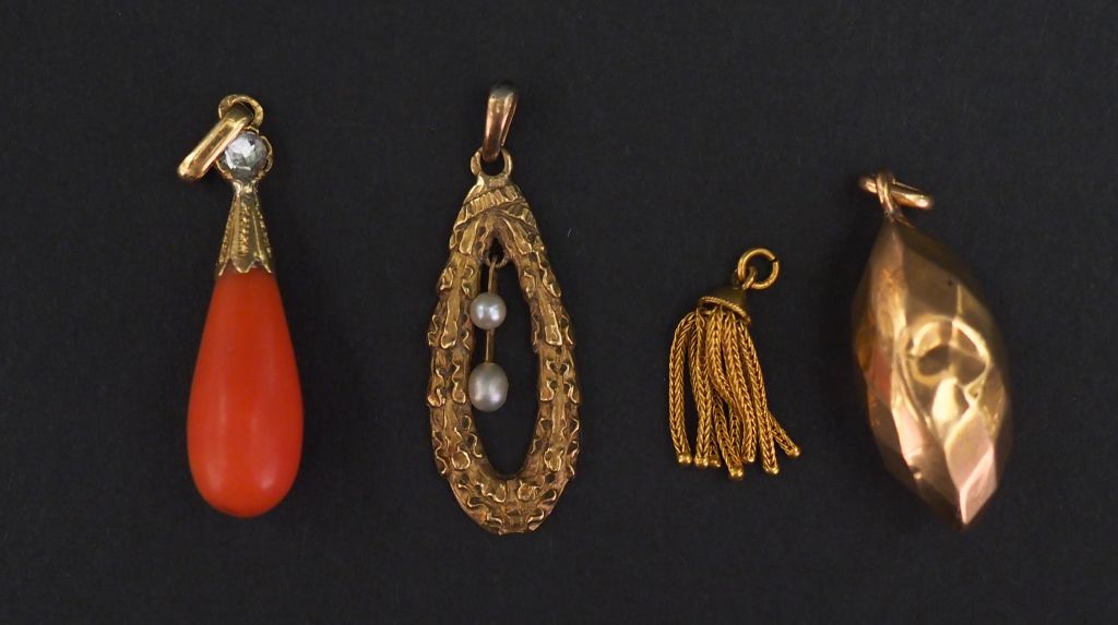 Ensemble comprenant : - un pendentif en or jaune en forme de pompon. H. 1,2 cm - un pendentif ovale facetté en or jaune. H. 2,3 cm (petit enfoncement) - un pendentif de style Louis XVI en or jaune, à décor de guirlande de feuillage et de perles en pendeloque. H. 2,5 cm - un pendentif en or jaune, serti de corail surmonté d'un diamant taillé en rose. H. 2,5 cm Poids tel. 6,01 g