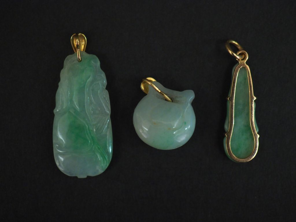 Ensemble comprenant : - un pendentif en or jaune et jadéite, à décor de motif feuillagé. H. 3 cm Poids tel. 3,24 g - un pendentif en or jaune et jadéite figurant une divinité. H. 2,5 cm Poids tel. 1,59 g - un pendentif en or jaune et jadéite figurant un chat. Poids tel. 3,26 g