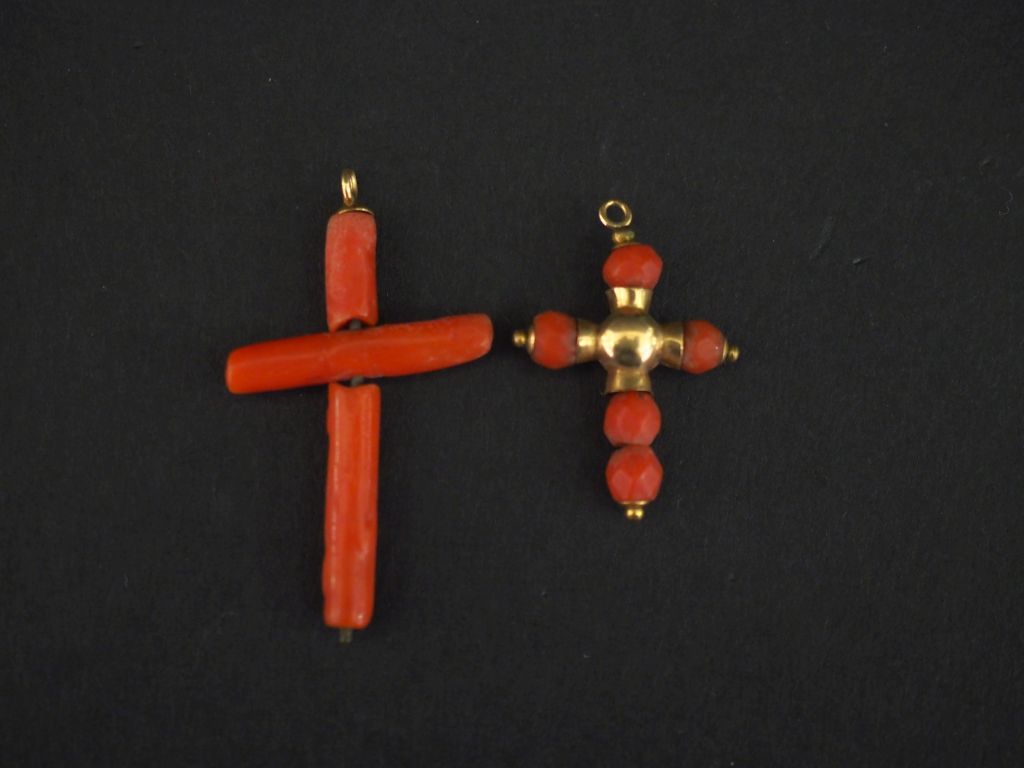 Ensemble comprenant : - un pendentif Napoléon III en or jaune 750 et corail en forme de croix. 2 x 1,7 cm Poids tel. 0,86 g - un pendentif en corail. Bélière en or jaune 750. 3,2 x 2 cm Poids tel. 1,32 g