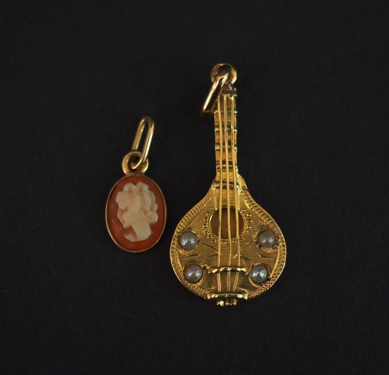 Ensemble comprenant : - un pendentif Napoléon III en or jaune et perles, en forme de luth. H. 2,7 cm - un pendentif en or jaune, serti en son centre d'un camée figurant une jeune femme de profil. H. 0,9 cm Poids tel. 2,71 g