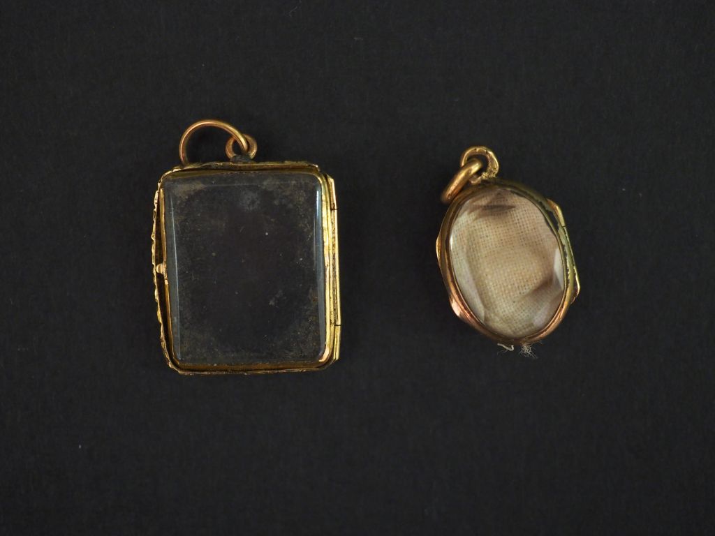 Ensemble comprenant : - un pendentif porte-photo en or jaune et verre facetté. Poids tel. 1,95 g - un élément de pendentif en or jaune et verre. Poids tel. 1,28 g (manque un verre)