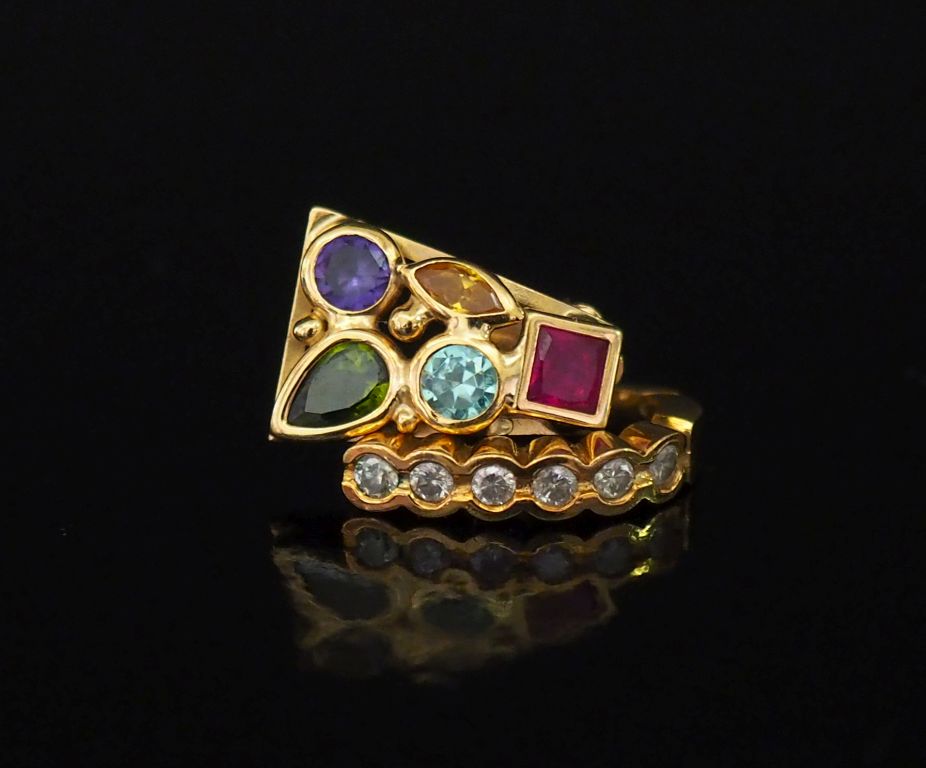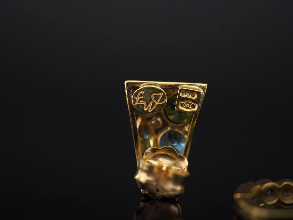 Ensemble comprenant : - un perce oreille vertical de forme bombée en or jaune, serti d'une ligne de six petits diamants. H. 1,5 cm - un perce oreille en or jaune, serti de pierres de couleur. H. 1,5 cm Poids tel. 4 g