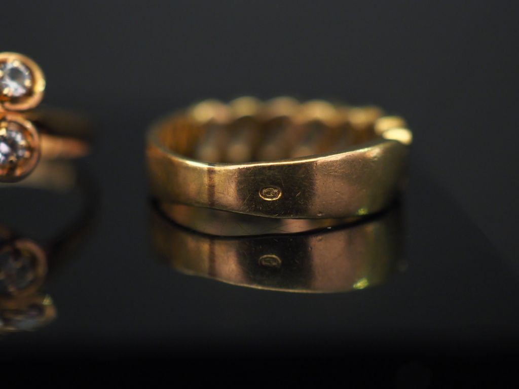 Ensemble comprenant : - une alliance américaine en or jaune, sertie de pierres à l'imitation du diamant. TDD. 57 - une bague jonc en or jaune, sertie de sept ligne de deux pierres à l'imitation du diamant. TDD. 49 g - une bague en or jaune en forme de fleur, sertie de pierres à l'imitation du diamant. TDD. 53 Poids tel. 11 g