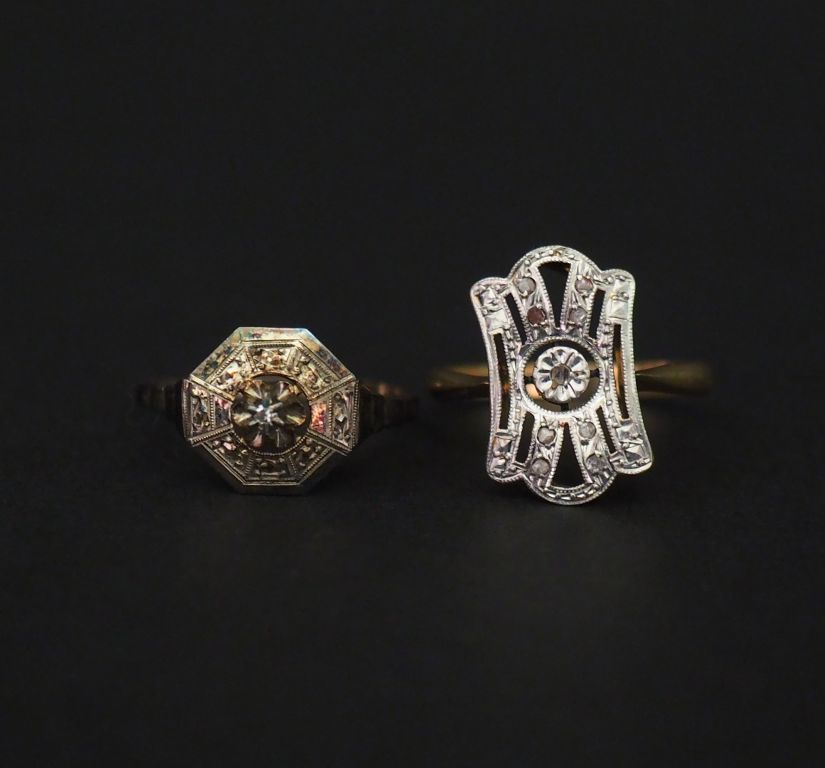 Ensemble comprenant : - une bague ajourée de style Art déco en or blanc, sertie de petits éclats de diamant. TDD. 52 - une bague octogonale de style Art déco en or blanc, sertie en son centre d'un petit éclat à l'imitation du diamant. TDD. 53 Poids tel. 3,62 g