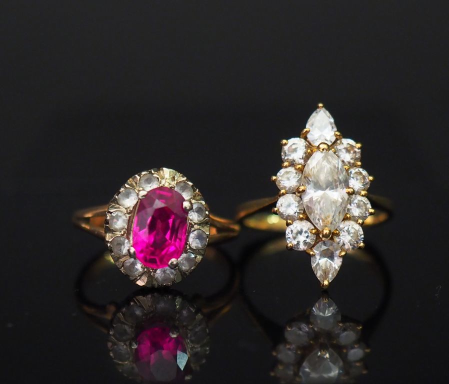 Ensemble comprenant : - une bague de forme marguerite en or jaune, sertie en son centre d'une pierre rose entourée de pierres à l'imitation du diamant. TDD. 54 - une bague de forme marquise en or jaune, sertie de pierres à l'imitation du diamant. TDD. 52 Poids tel. 8,64 g
