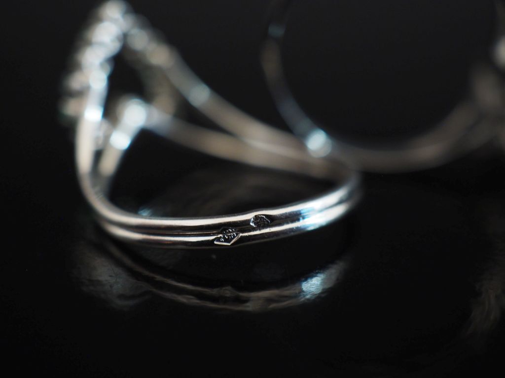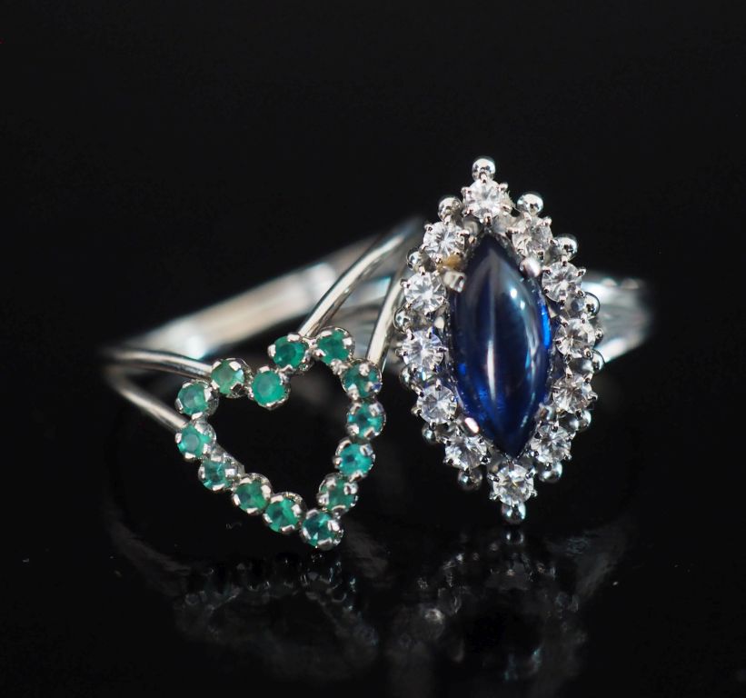 Ensemble comprenant : - une bague de forme marquise en or blanc 750, sertie en son centre d'une pierre bleu en cabochon et entourée d'une couronne de pierres à l'imitation du diamant. TDD. 51 - une petite bague en or blanc 750, ornée d'un cœur serti de petites pierres vertes. TDD. 50 1/2 Poids tel. 5 g