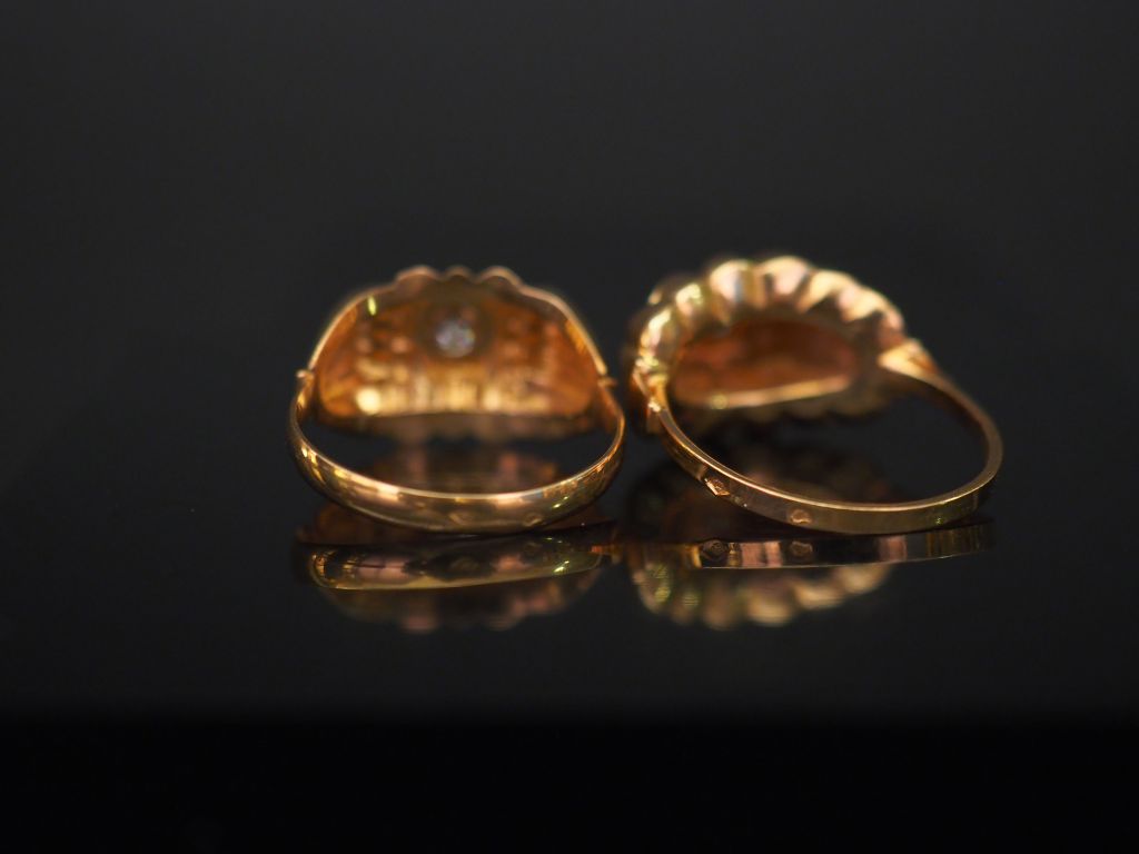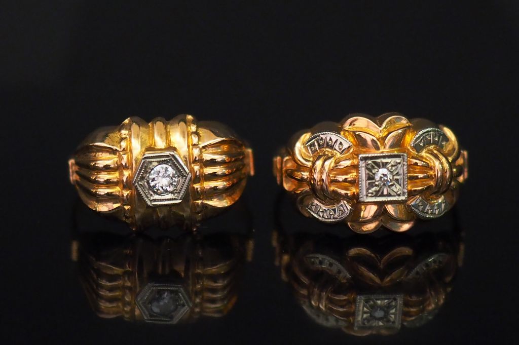 Ensemble comprenant : - une bague de style 1940 en or jaune, sertie en son centre d'un diamant taille ancienne. TDD. 57 - une bague en or jaune, à décor de motifs stylisés et sertie en son centre d'un petit diamant. TDD. 57 Poids tel. 4,14 g