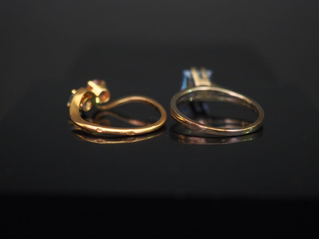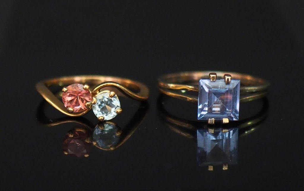 Ensemble comprenant : - une bague dite "Toi Moi" en or jaune, sertie d'une pierre rose et d'une pierre bleue. TDD. 54 - une bague moderne en or blanc, sertie en son centre d'une pierre bleue. Monture ajourée. TDD. 56 Poids tel. 5,32 g