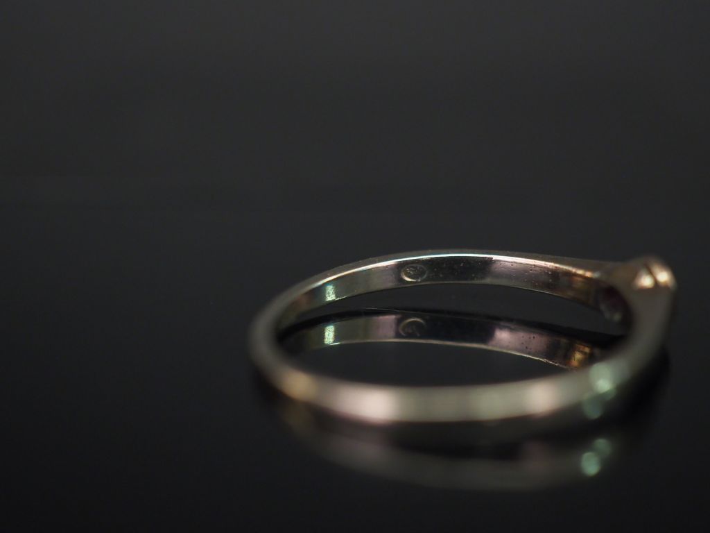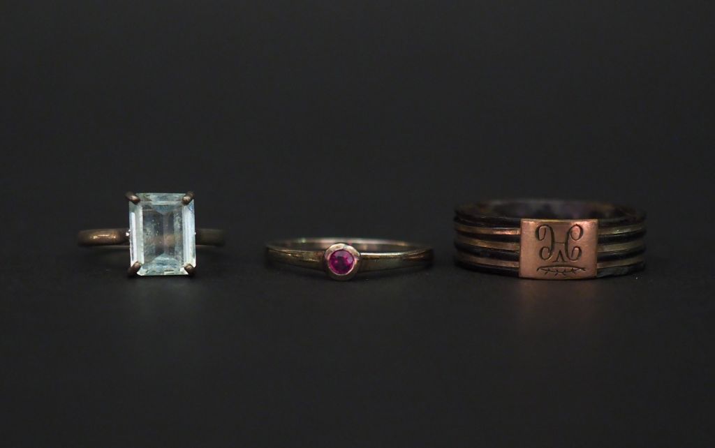 Ensemble comprenant : - une bague en argent, sertie en son centre d'une pierre bleu ciel. TDD. 48 Poids tel. 1,60 g - une bague jonc en composition et métal doré, à décor de monogramme. TDD. 58 (usures) - une petite bague en or blanc 9k, sertie en son centre d'une pierre rose. TDD. 56 Poids tel. 1,61 g