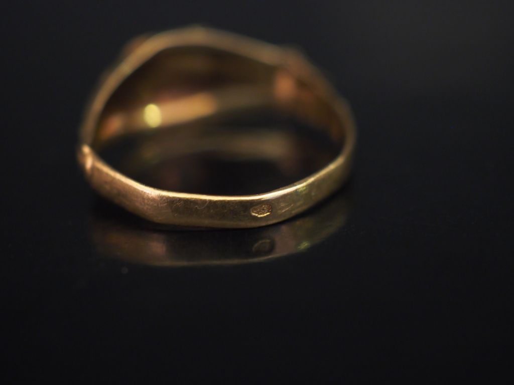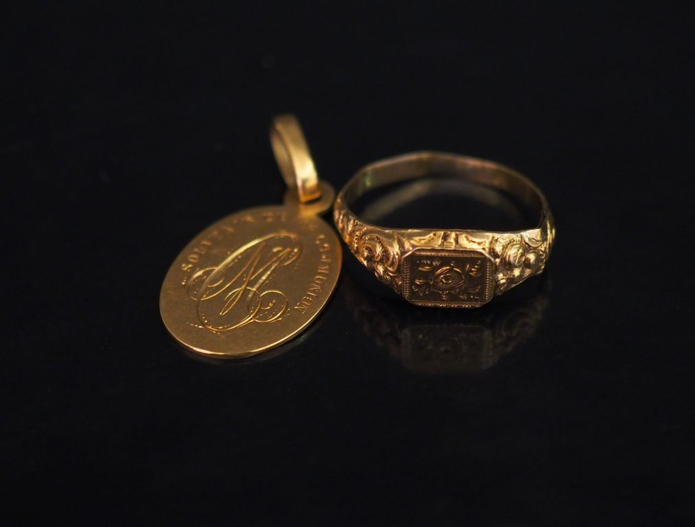 Ensemble comprenant : - une bague en or jaune, à décor de rinceaux et d'une fleur gravée en son centre. TDD. 53 (accident) - une médaille commémorative en or jaune. Gravée. Poids. 3,99 g