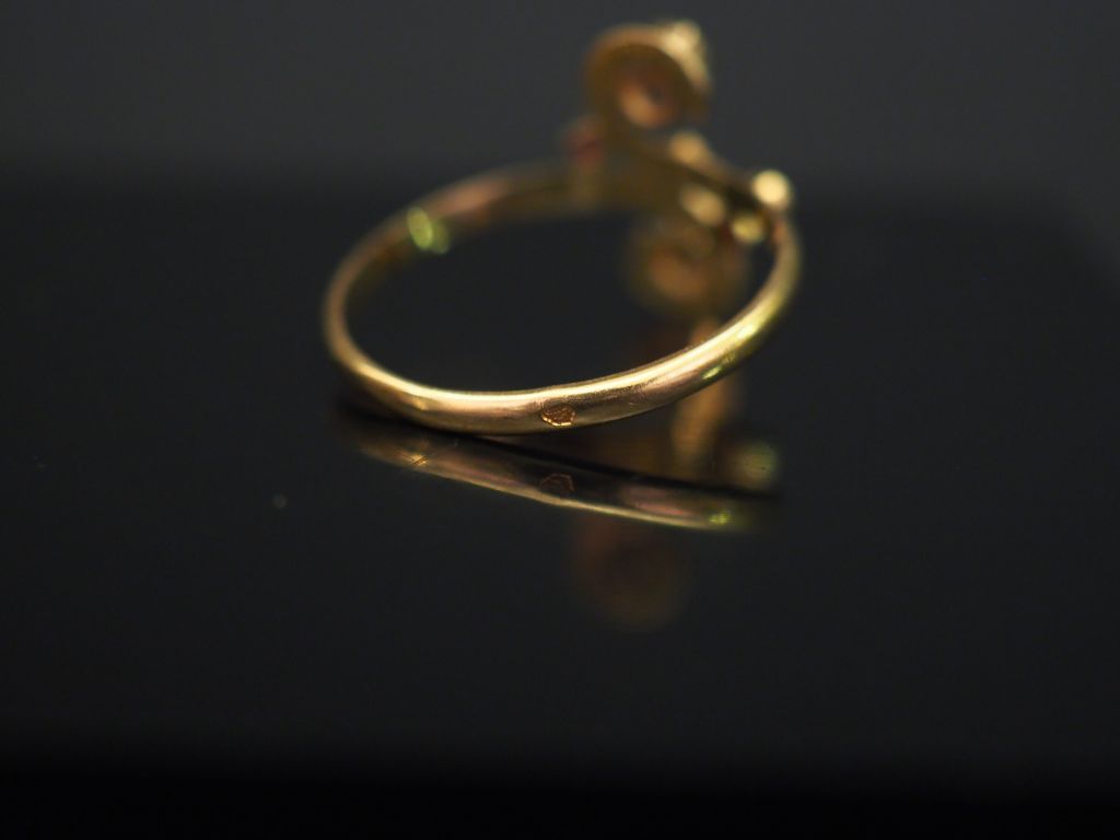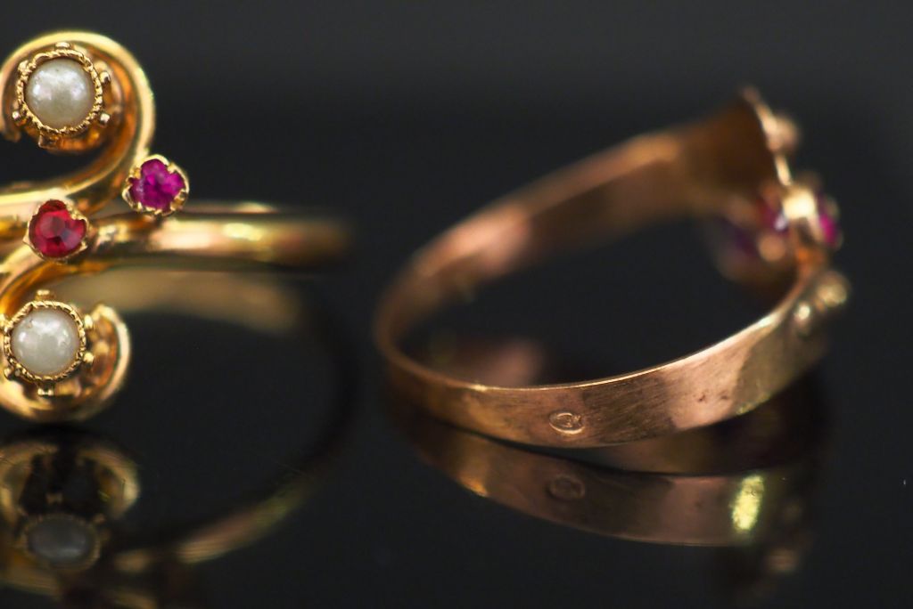 Ensemble comprenant : - une bague en or jaune, à décor d’une serpent et sertie d’une pierre bleue. TDD. 55 - une bague de forme stylisée en or jaune, sertie de trois petites pierres roses. TDD. 51 - une bague de forme stylisée en or jaune, sertie de deux perles et trois pierres roses. TDD. 57 Poids tel. 5,33 g