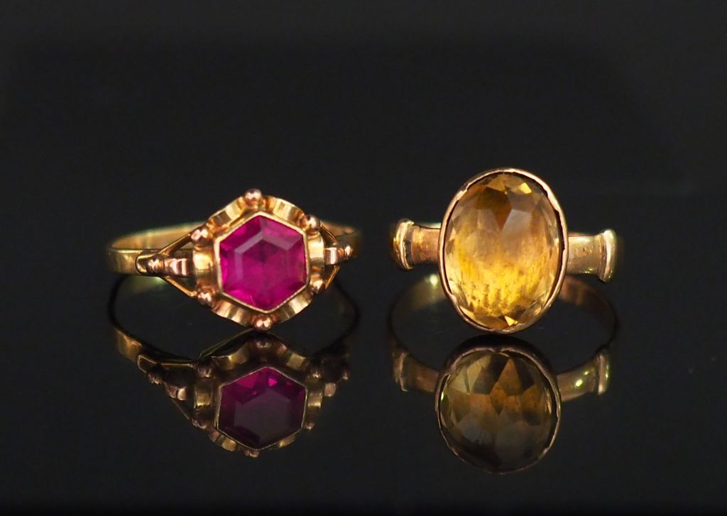 Ensemble comprenant : - une bague en or jaune, sertie en son centre d'une pierre jaune. TDD. 59 - une bague en or jaune 14k, sertie en son centre d'une pierre rose. TDD. 55 (anneau légèrement tordu) Poids tel. 4,02 g
